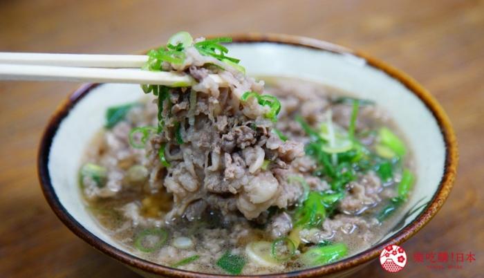 最後要介紹來大阪難波、心齋橋一帶必吃的隱藏巷弄美食食堂「千歲」!店鋪開自1951年,原本是牛肉烏龍麵專賣店,至今已傳至第三代,其中的招牌料理「肉吸湯」,據說是吉本興業的喜劇演員花紀京發想出來的。有一天,花紀京在演出空擋來這邊用餐,因為前一天喝酒宿醉,和第二代老闆點了一道牛肉烏龍麵不要烏龍的餐點,老闆貼心為他客制,想不到後來口耳相傳之下,成為如今的人氣選單。肉吸湯每天限量100份,賣完為止,且不開放預約,常常不到下午2點就全數賣完,想吃的話記得提早到現場排隊!