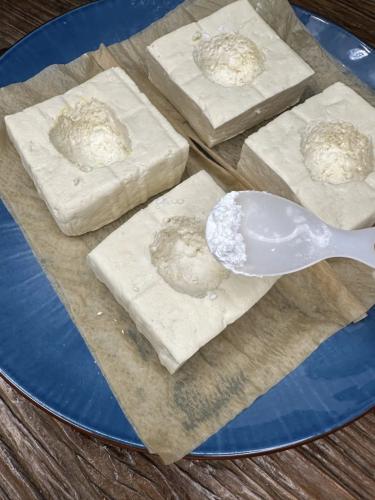豆腐用廚房紙吸乾水分,用勺子在豆腐上挖下一塊,裡面抹上生粉,以防止內餡掉出來,再填滿香菇豆腐醬;