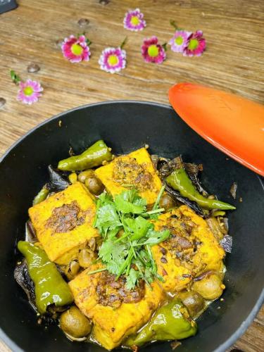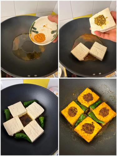 鍋裡放油,撒入薑黃粉和黑胡椒粉,煎豆腐,先煎釀餡料的一面,定形後翻面,釀好的辣椒也同時放入鍋內一起煎,煎至兩面微焦,盛出備用;