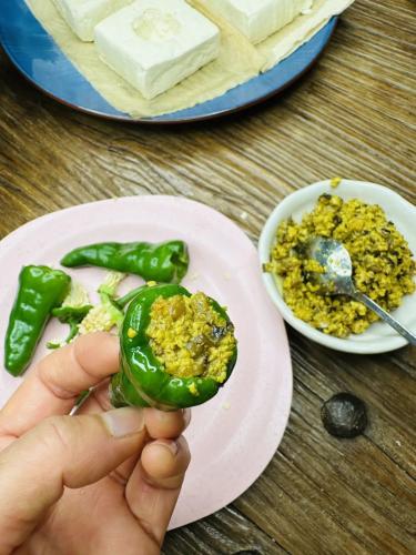 青辣椒去蒂去瓤,釀入香菇豆腐醬;
