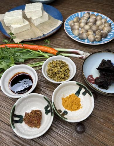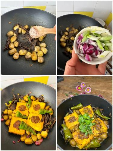另起鍋,用油炒香洋蔥、青蒜、草菇,加入豆瓣醬、素蠔油、水,放黑虎掌菌、煎好的豆腐和辣椒,小火慢煮10分鐘,撒香菜起鍋 。