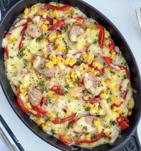 洋蔥切絲放入鍋中加入植物油炒香後加入黃油,彩椒、玉米粒、洋蔥絲,炒出香味,關火後加入20g低筋麵粉和120ml牛奶,攪拌均勻後開中小慢慢熬出喜歡的黏稠度,加鹽和黑胡椒調味,烤盤上鋪一層白米飯,將熬好的白醬汁蔬菜鋪在上面,最上面撒上馬蘇裡拉芝士碎,烤200度 烘烤10-15分鐘。