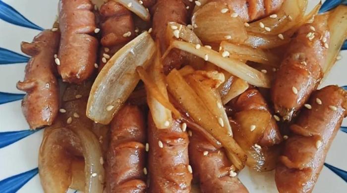 炒洋蔥,再放香腸,加蠔油、生抽、少許鹽,翻炒均勻,燜兩分鐘,撒白芝麻,就可出鍋。