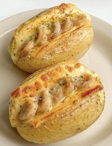 土豆底上部切去一塊,刷黃油,撒黑胡椒海鹽,烤箱預熱200度烤30分,芝士片切小片,烤腸,、烤腸、馬蘇裡拉,220度烤6分鐘,出爐撒歐芹。