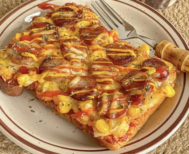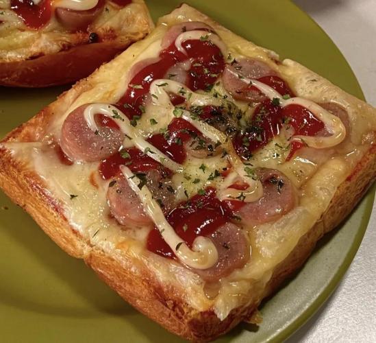 吐司刷番茄醬,鋪香腸片、芝士,番茄醬,沙拉醬,歐芹碎,烤180度8分鐘,拉絲爆漿。