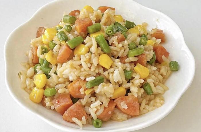 隔夜米飯加香腸丁,豆角,雞蛋,玉米粒翻炒,淋醬油調味,油潤紅亮的香腸粒包裹米粒。