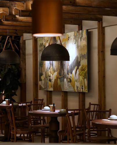 上下兩層高挑空間,裸露牆體與鐵藝、金屬組成獨有的粗獷藝術氣息,極簡的奢華與低調做到了極致,融入韓國頂級大師藝術作品。藝術與美食的雅緻結合,別有韻味。